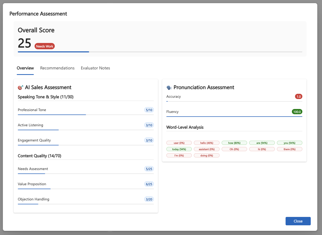 At the end of the conversation, the full transcript is sent to a GPT-4o model for evaluation. This “LLM-as-judge” pattern allows us to display a detailed scorecard covering key competencies.