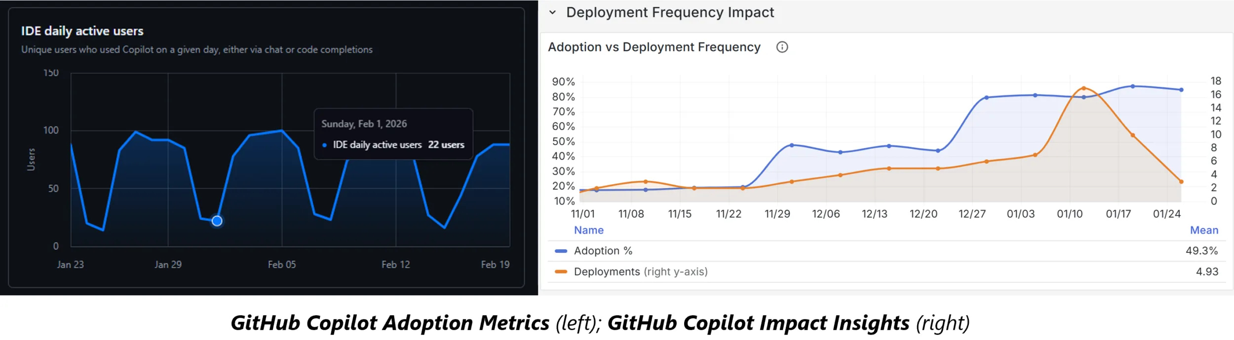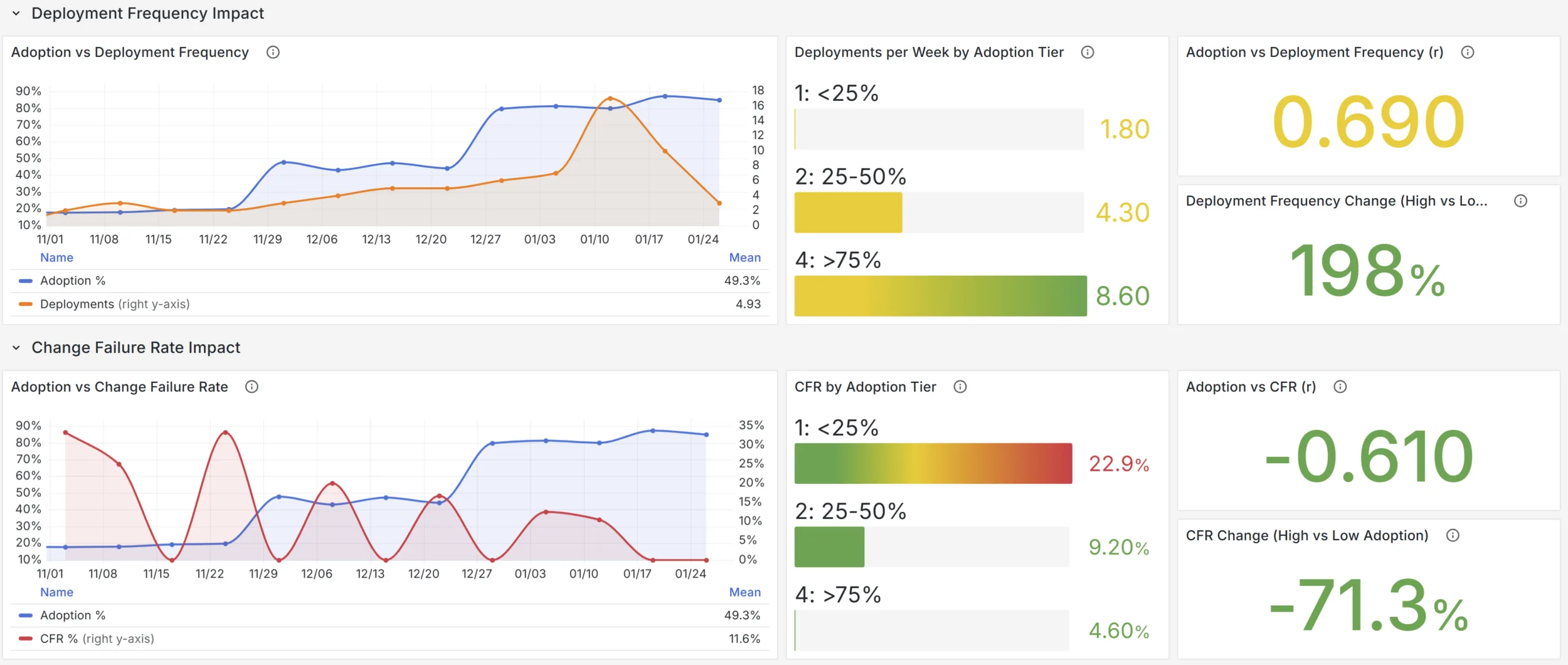 An example insight you might see: “Weeks with above 75% Copilot adoption showed 33% faster PR cycle times and 2x deployment frequency compared to weeks below 25%.” That’s the kind of data point that starts answering the right questions.