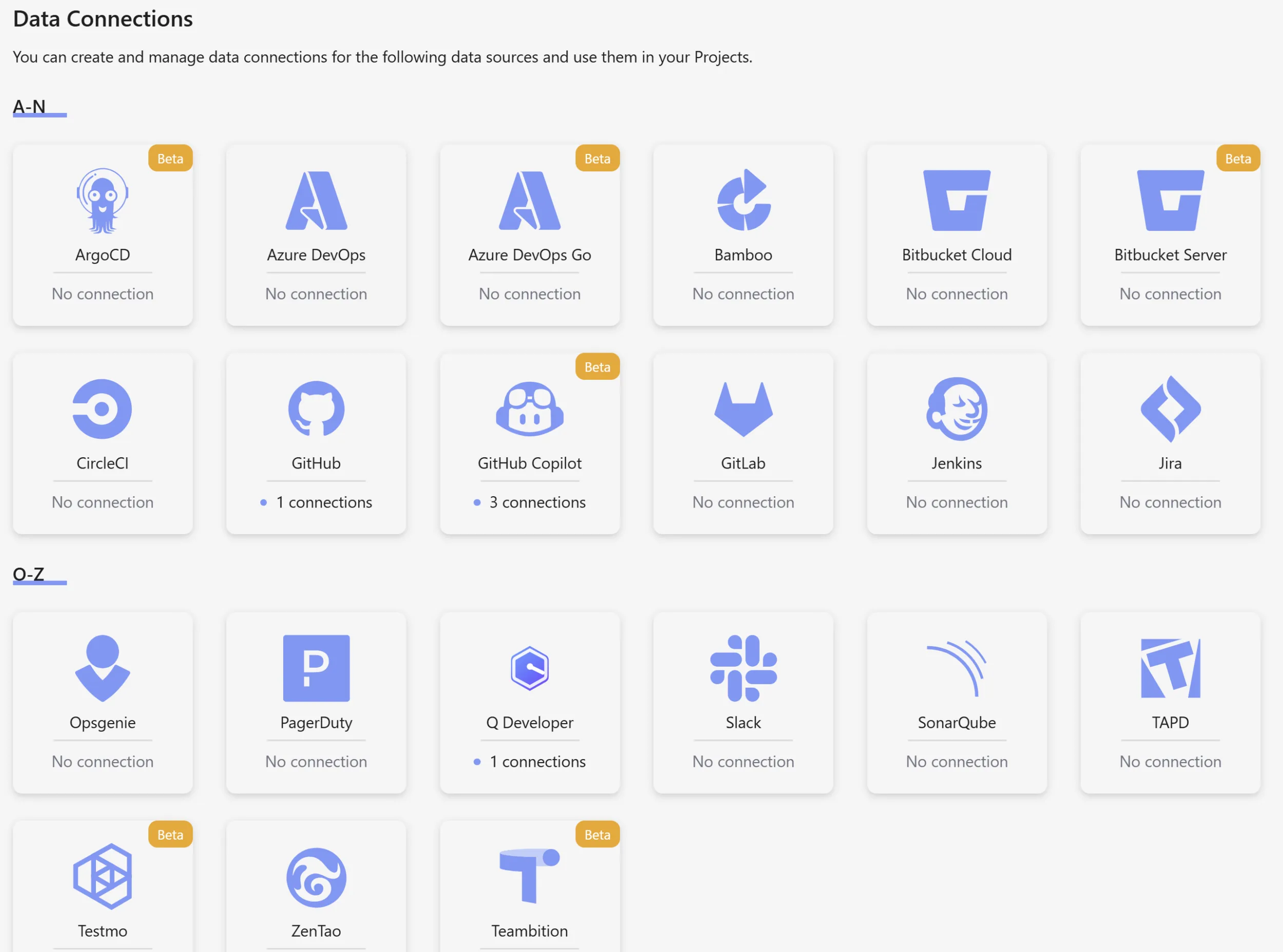 • Connections — authenticated links to each data source (your GitHub org, your Jira instance, your Jenkins server)
