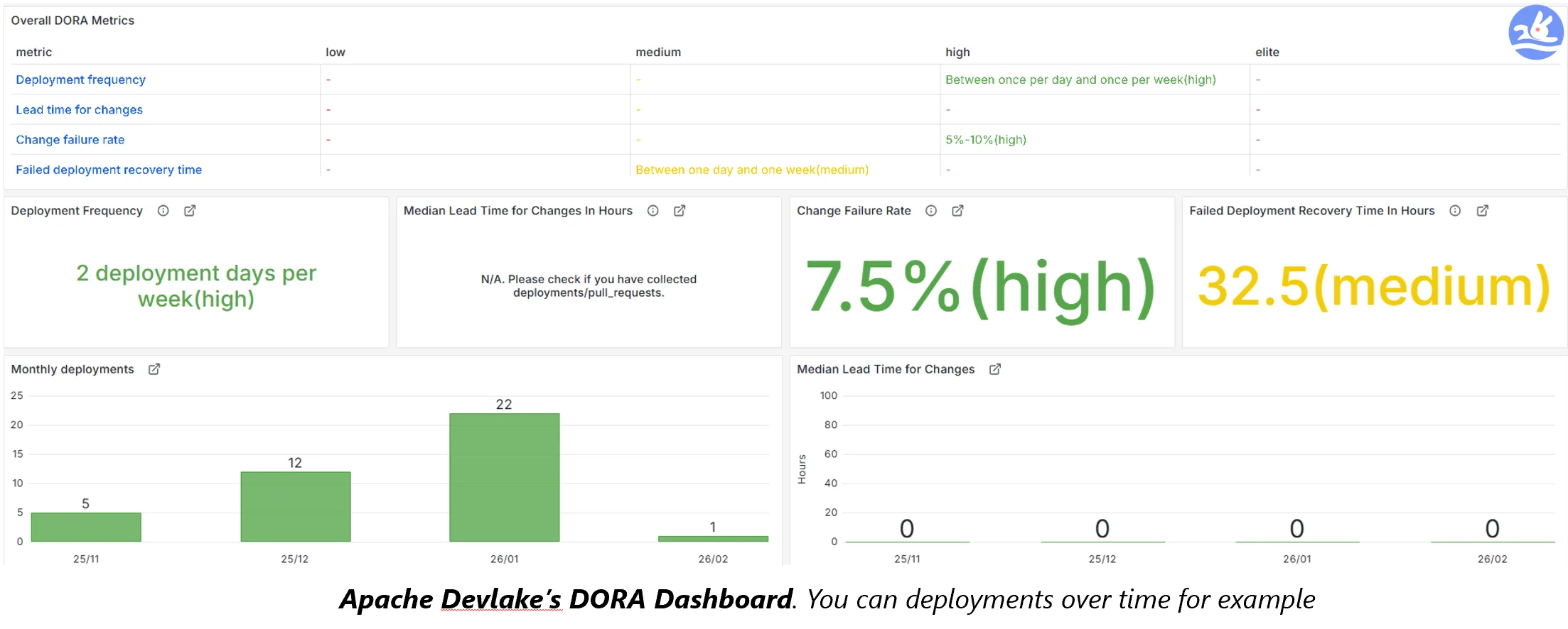 DevLake implements DORA with built-in Elite/High/Medium/Low benchmarking. You don’t need to calculate the metrics yourself or figure out how to map your CI/CD data to the framework. Configure your deployment patterns and incident labels, and DevLake does the rest.