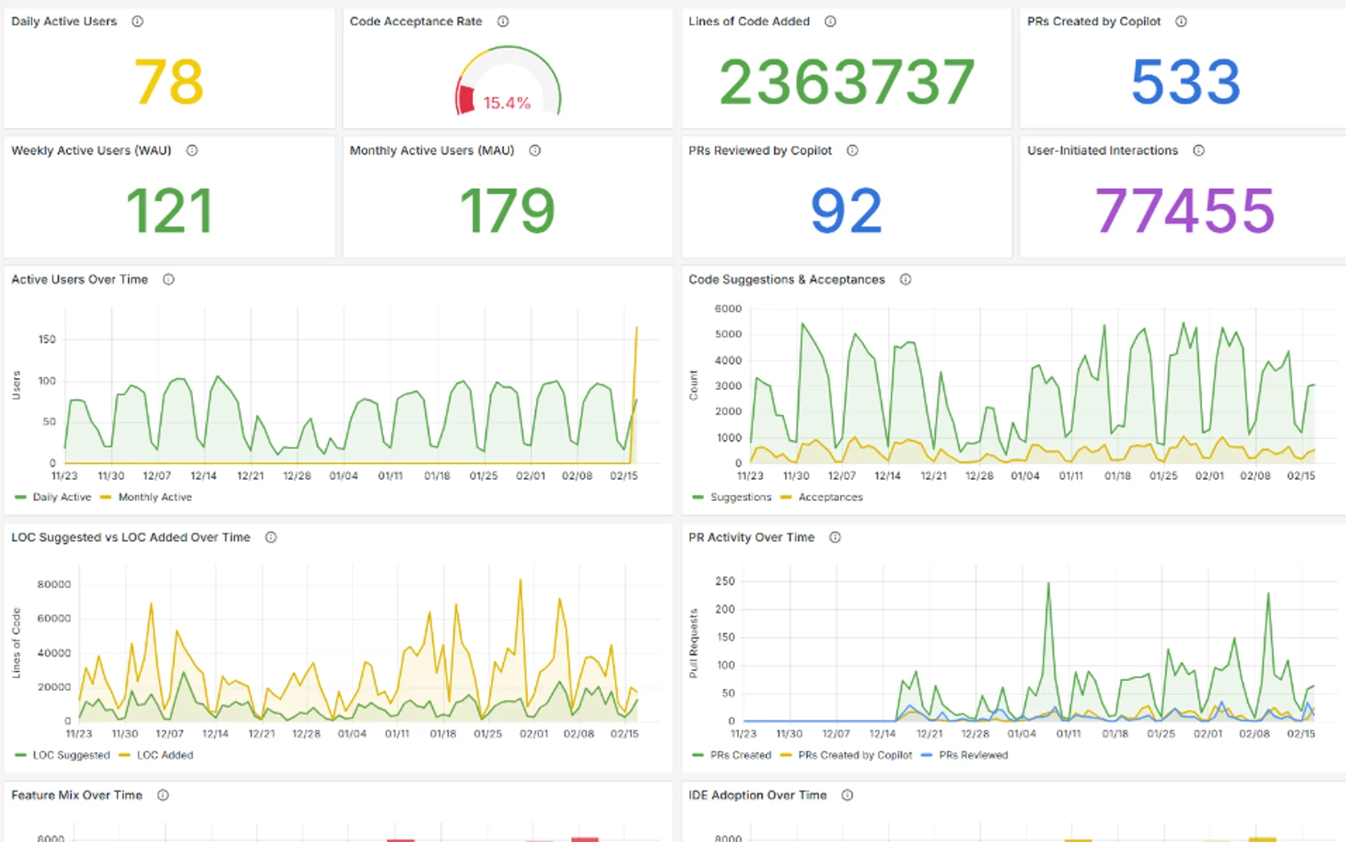 • Feature breakdown — completions vs. chat vs. PR summaries