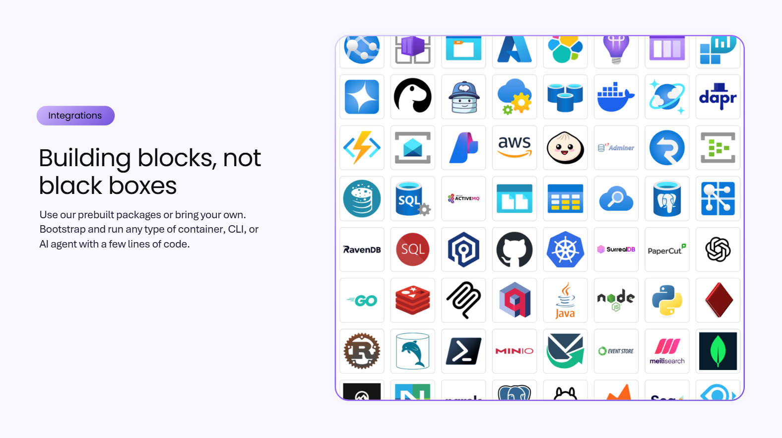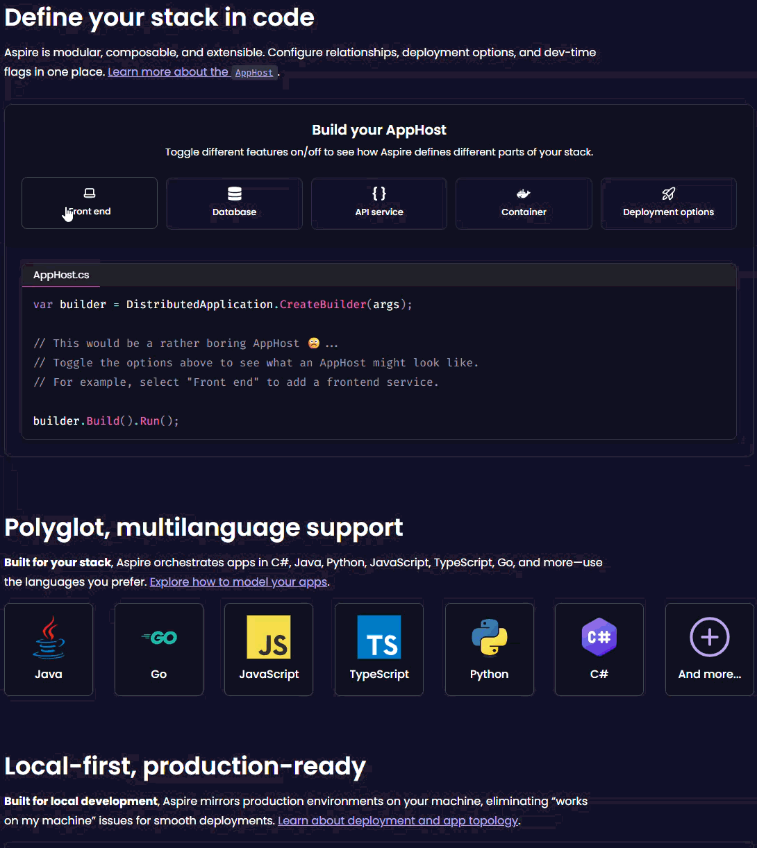 With our polyglot expansion, Aspire can be used on any app and every layer of your stack. Whether you’re building in C#, Python, JavaScript, or integrating services like Redis, PostgreSQL, RabbitMQ, Aspire provides a unified way to develop, observe, and deploy any application.