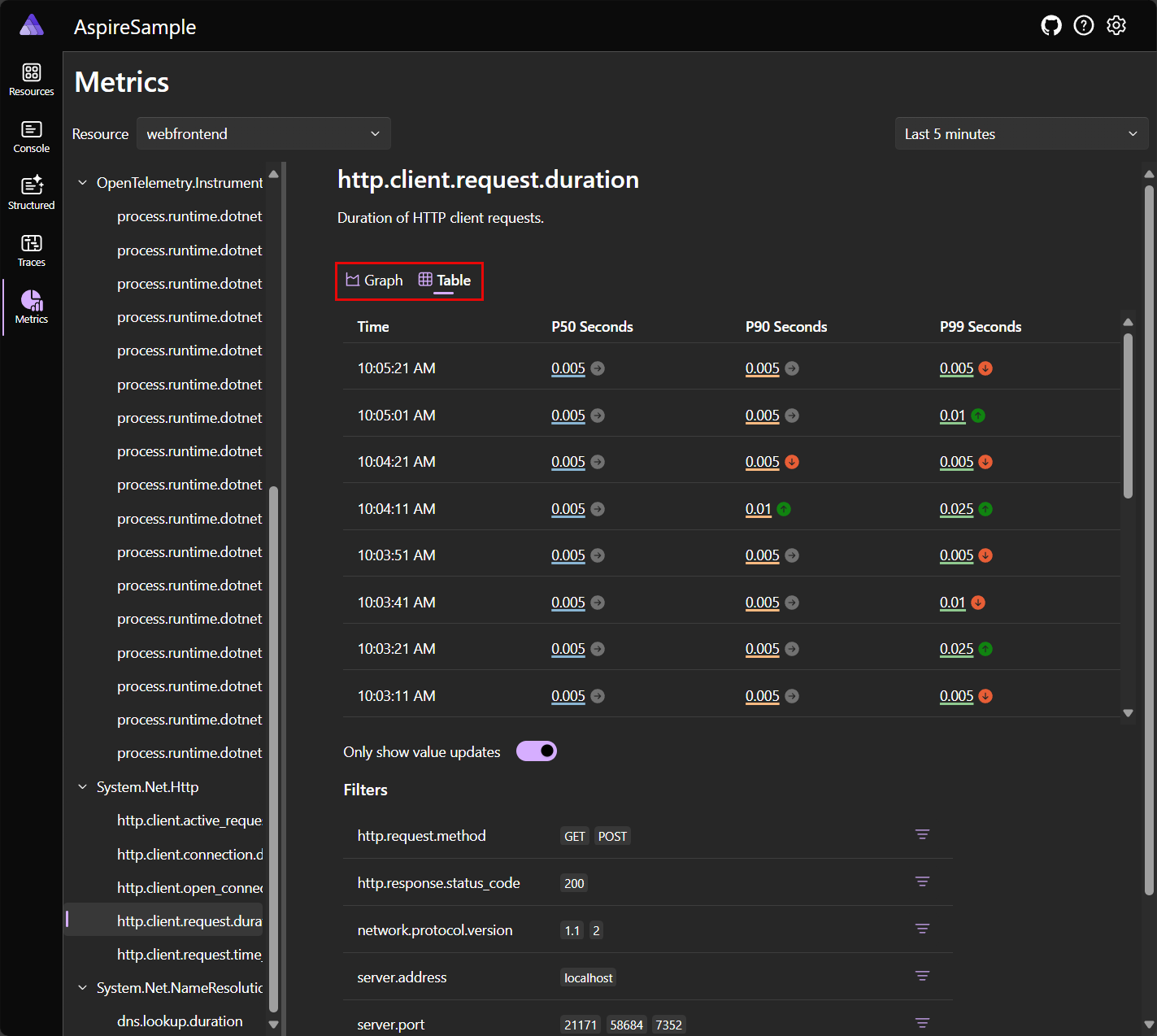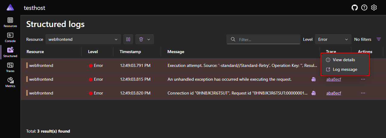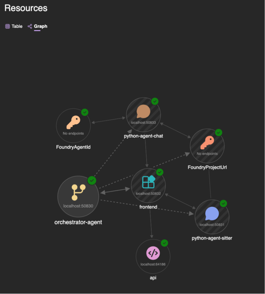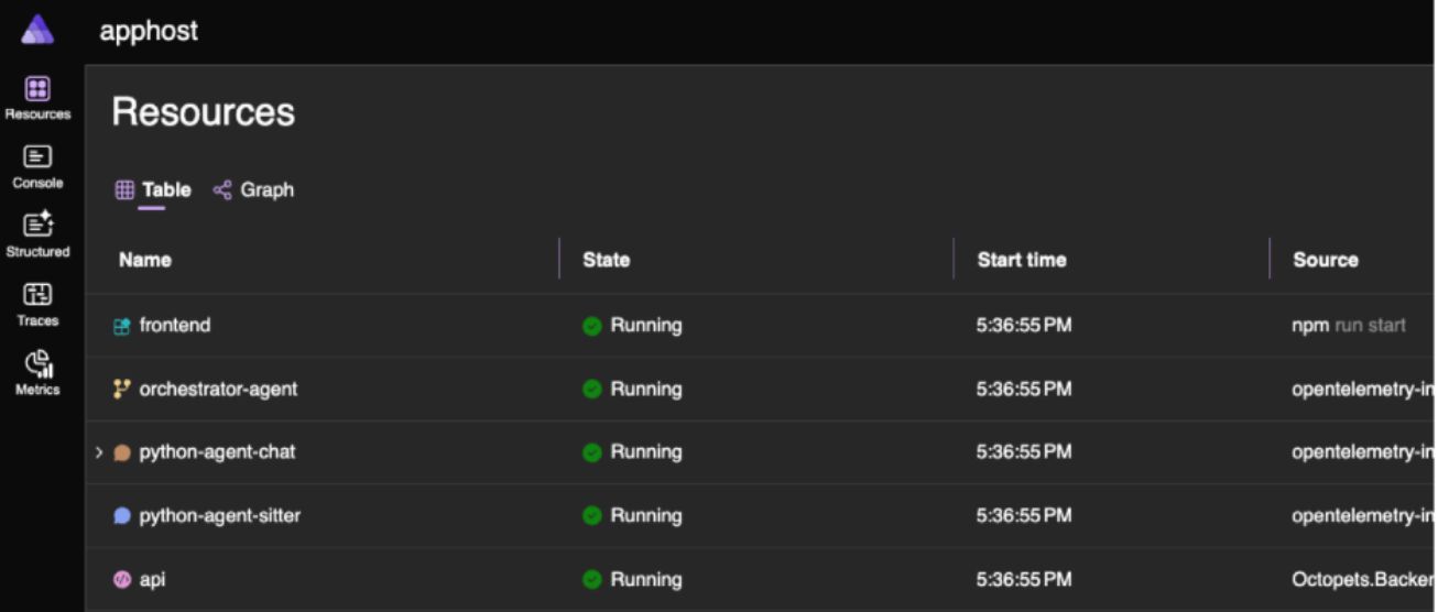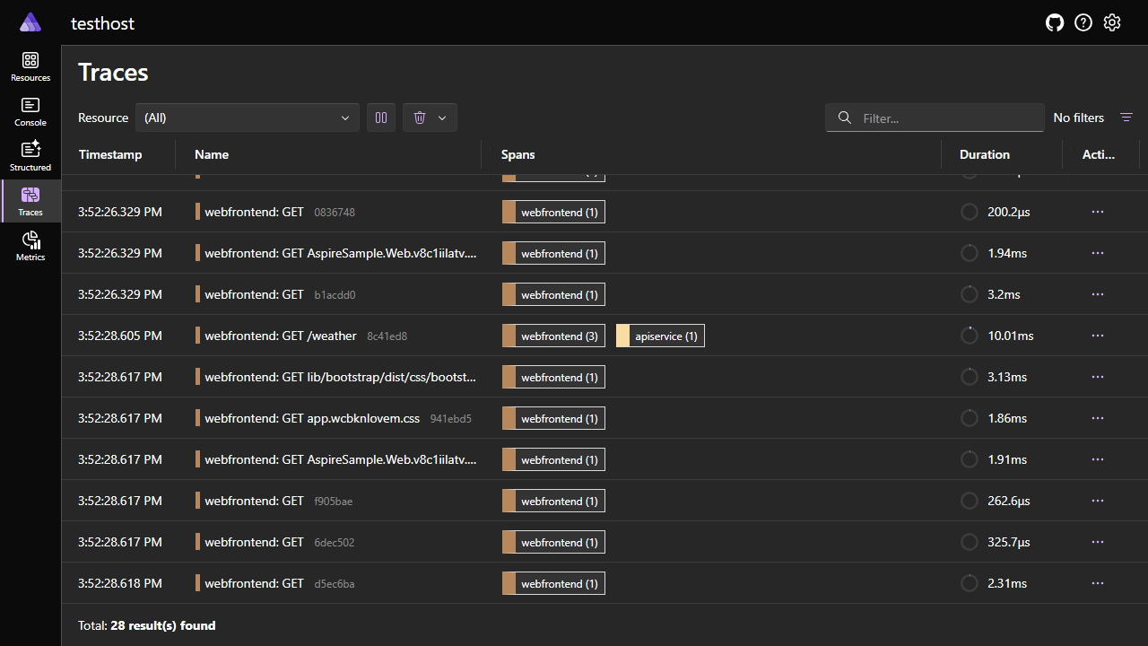 When a resource is added to the AppHost, it automatically appears in the Aspire Dashboard. This provides a unified view of all your app’s services, with structured logs, console output, traces, and key metrics collected automatically.