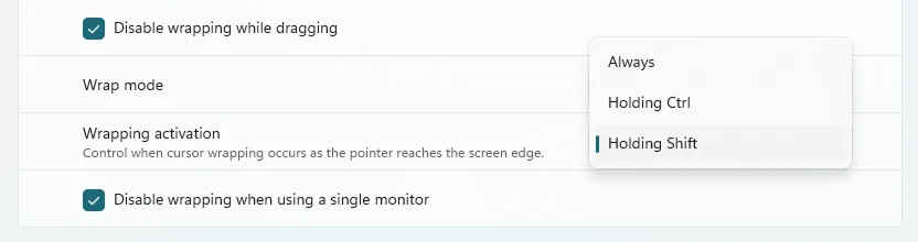 CursorWrap also received several improvements in this release based on community feedback. The wrapping engine has been rewritten to better support complex multi-monitor layouts, making the behavior more reliable across different setups. We also added a few new options, including the ability to disable CursorWrap when only a single monitor is connected, and a new activation mode that lets you wrap the cursor only while holding Ctrl or Shift.
