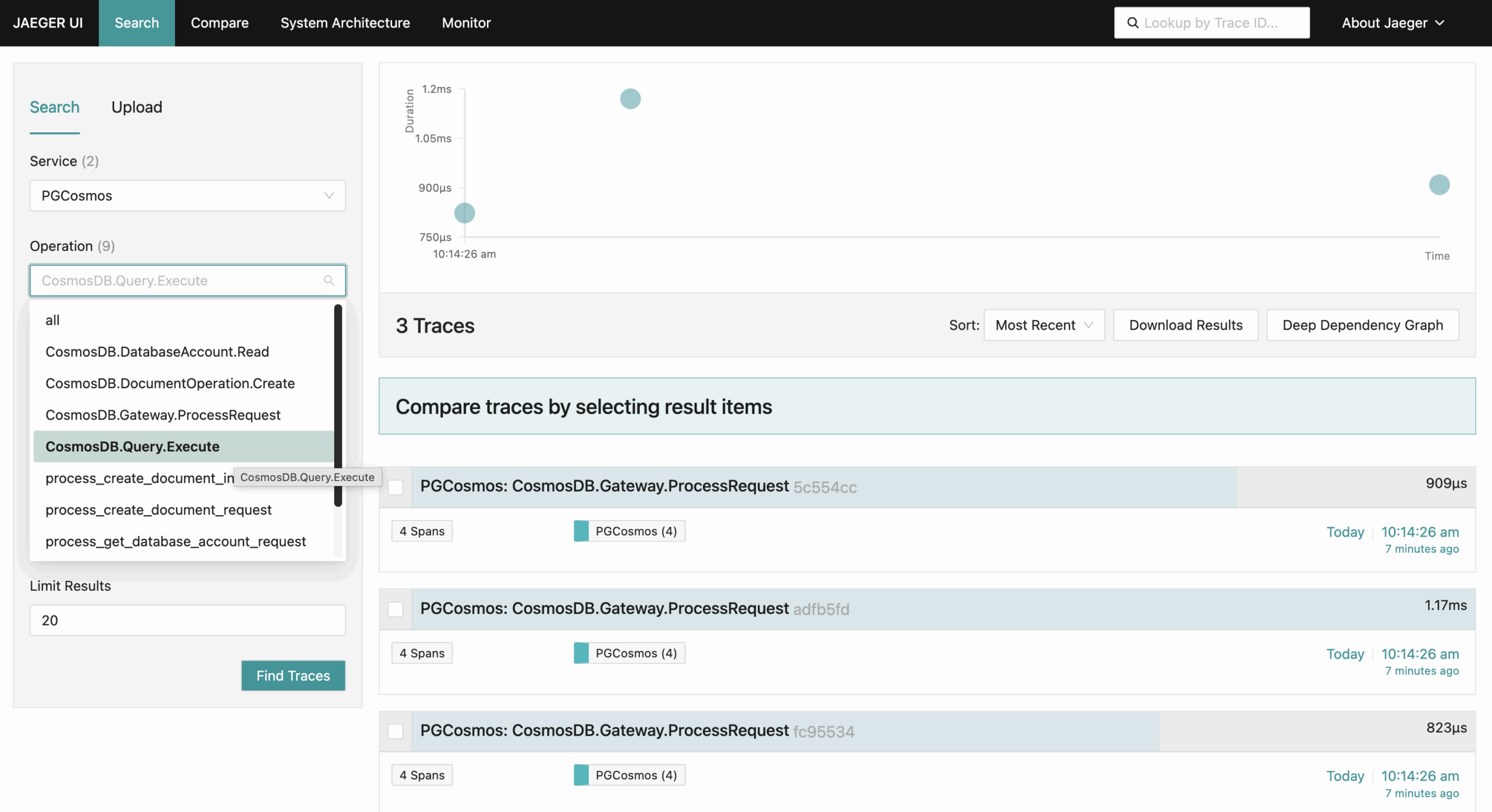 Check the Jaeger UI at http://localhost:16686 to view distributed traces, search for specific operations, analyze request latency, and inspect the execution flow of your queries through the Azure Cosmos DB Emulator: