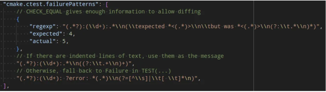This release also improves the CTest experience by adding support for configurable failure patterns. With the new Failure Patterns setting, you can tell CMake Tools how to interpret test output so failures surface more useful and structured information.