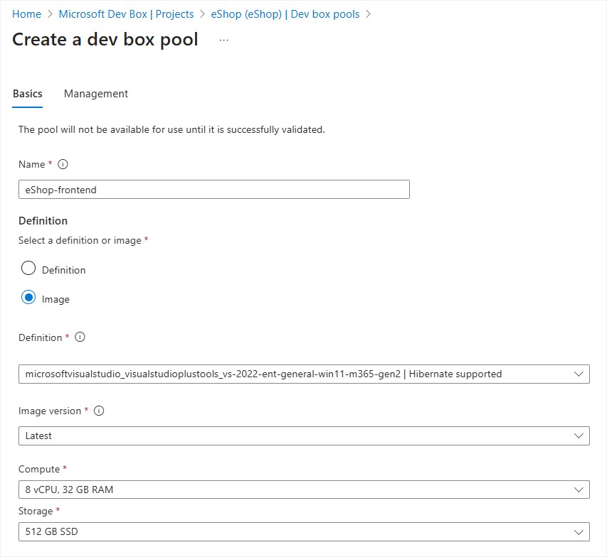 Until now, configuring Dev Box pools with Azure Marketplace images or custom images from Compute Galleries required a pre-defined Dev Box definition at the Dev Center. These definitions packaged the image along with compute and storage SKUs, and were then referenced by project-level pools.