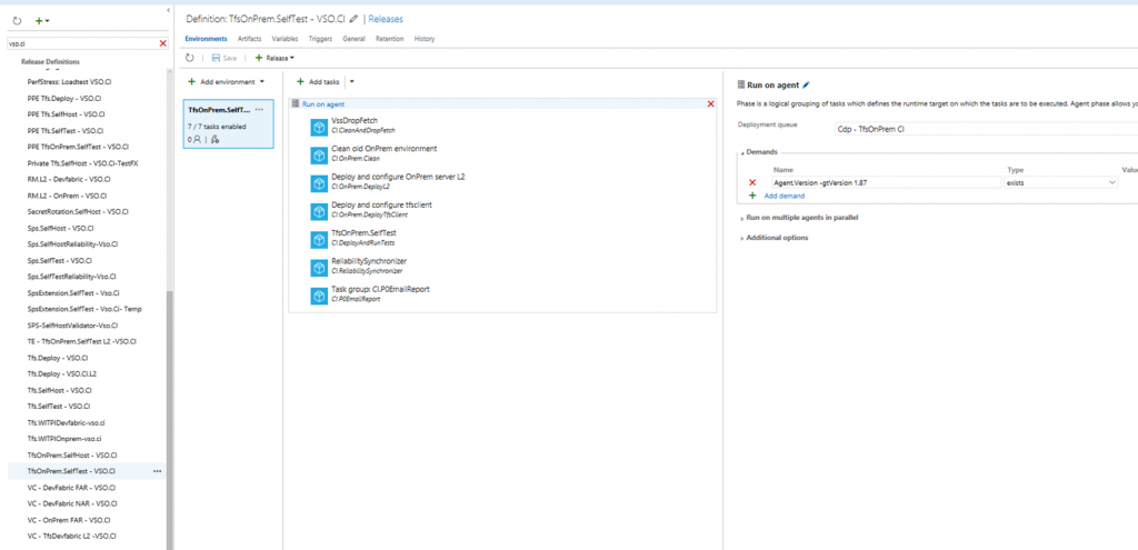 Before RM, all teams were using an internal home grown tool called RollingTest and tfsruns for their continuous integrations runs. This tool was used by each feature team to configure their CI run(s) and to monitor them build over build for their product quality. In each of these runs, teams were deploying their product in a particular configuration and then running tests against it to check quality. For example: – test management feature team had one run for their on-prem configuration for master branch, one for dev-fabric configuration (i.e. VSTS setup) for master branch and similar configurations for release branches etc. The tool was being used by each of the VSTS service to monitor the quality for internal testing, and deployment like TFS service had