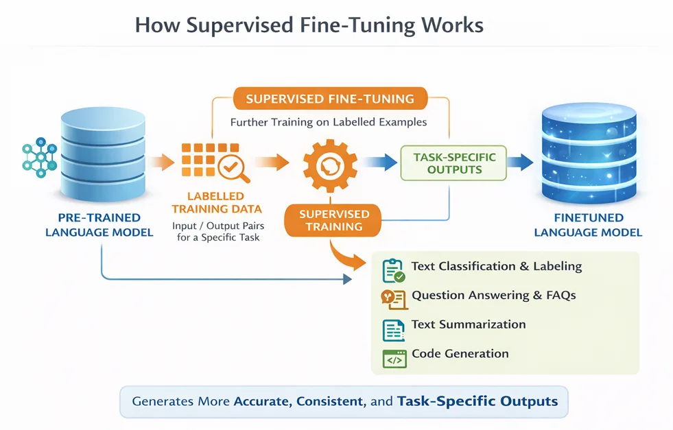 Supervised Fine-Tuning (SFT)Â is foundational training technique that trains a pre-trained model on input-output pairs for a specific task. It helps the model give more accurate, consistent, and task-specific responses, such as summarizing text, answering questions, or generating code, while keeping the knowledge from the original base model.