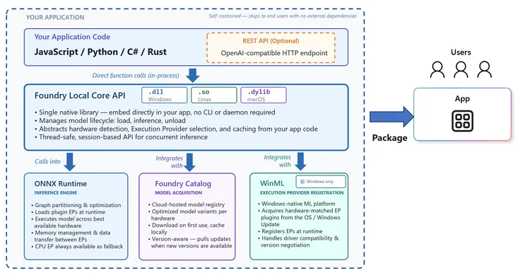 When you install the SDK, the Foundry Local Core and ONNX Runtime binaries are automatically downloaded and bundled into your application during build as a dependency. The Foundry Local SDKs (Python, JavaScript, C#, Rust) are thin wrappers that call into the Foundry Local Core native library, which is the main runtime managing the model lifecycle (download, load into device memory, inference management, and unload). Foundry Local integrates with Foundry Catalog to download models on first run that are optimized for the device hardware, which is done intelligently so that end users will get the most performant model for their hardware. On subsequent runs, the model is loaded from local cache on the user’s device.