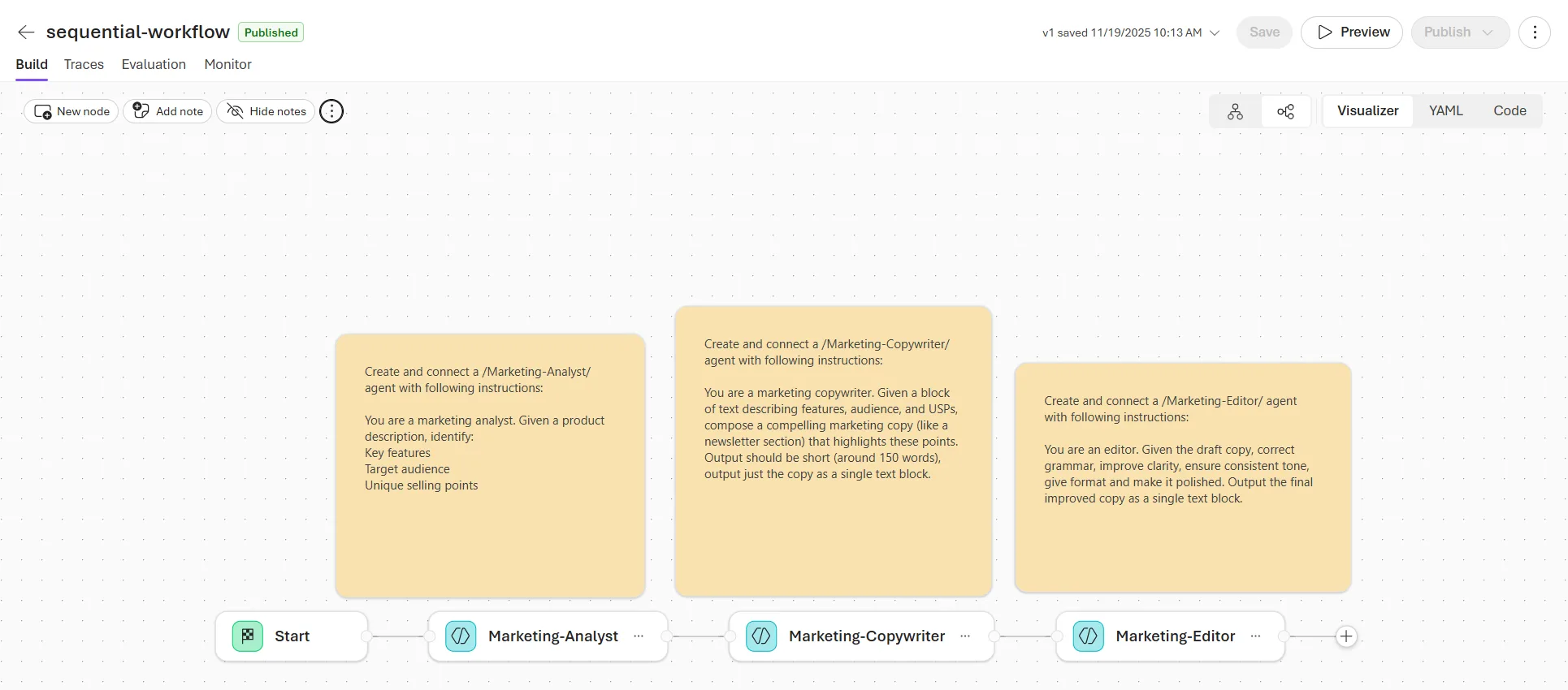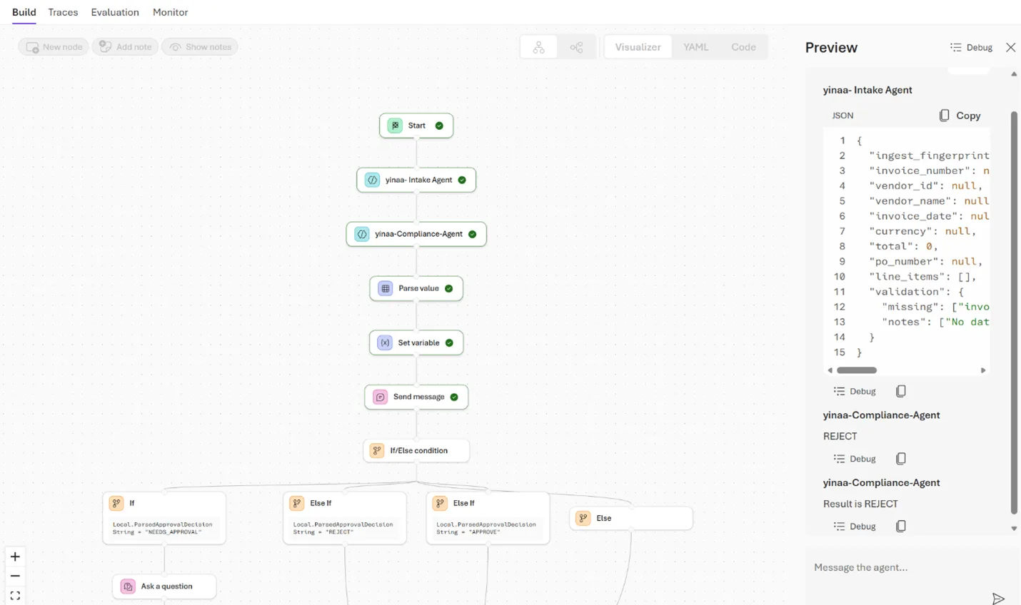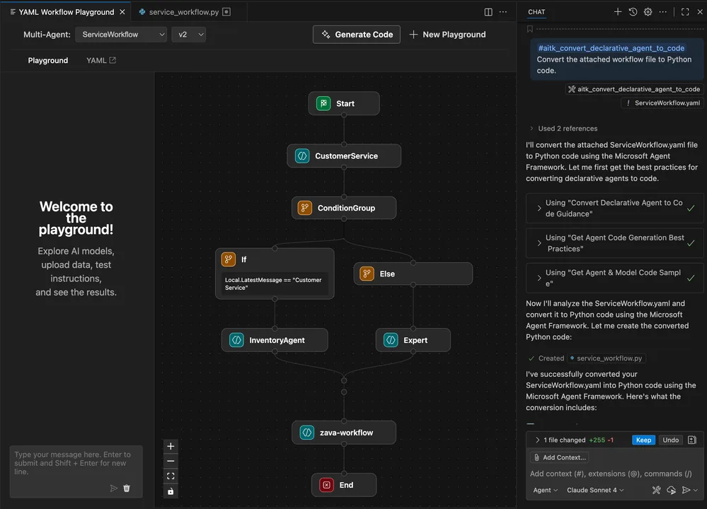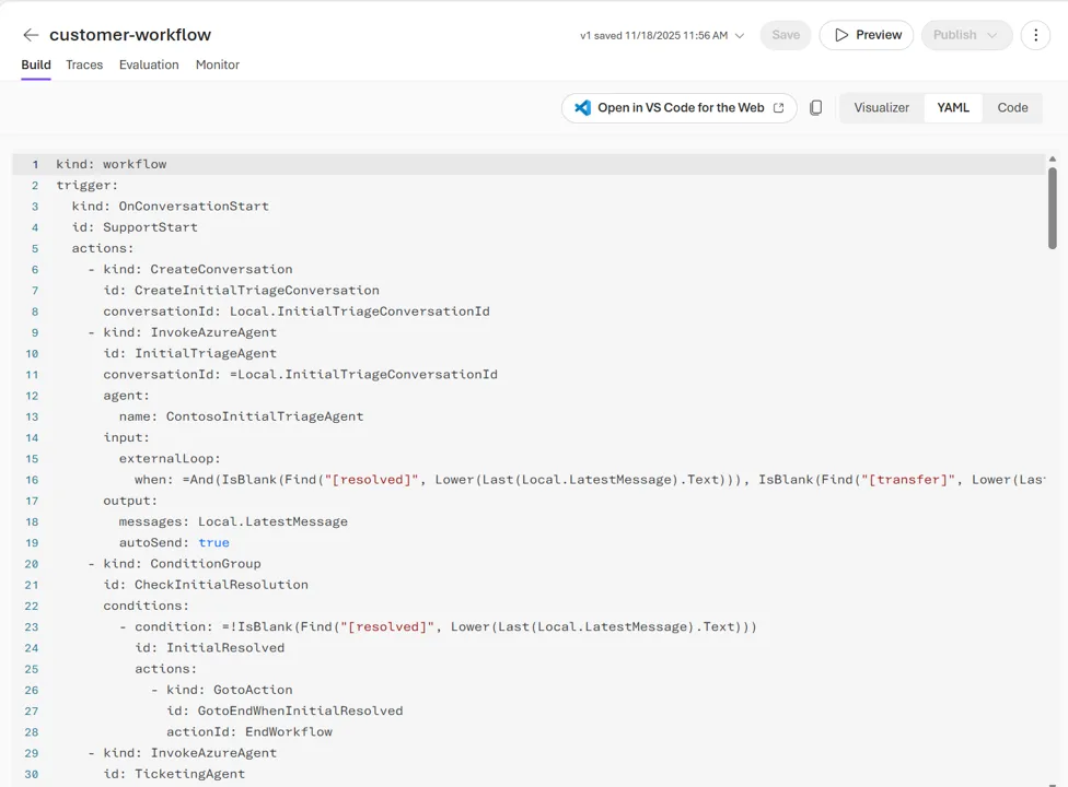 Workflows are available now in both the Foundry portal and the VS Code extension. The visual designer lets teams drag, connect, and configure agents, tools, and data flows to model processes such as onboarding, financial approvals, or IT service operations. For developers who prefer code, the YAML definition provides precision, versioning, and seamless integration with CI/CD pipelines.