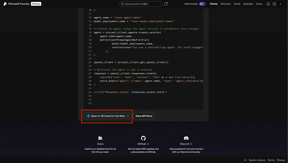 - Jump from the Foundry portal to VS Code for the Web to inspect workflow structure and generated sample code to develop in your preferred code editor setting.
