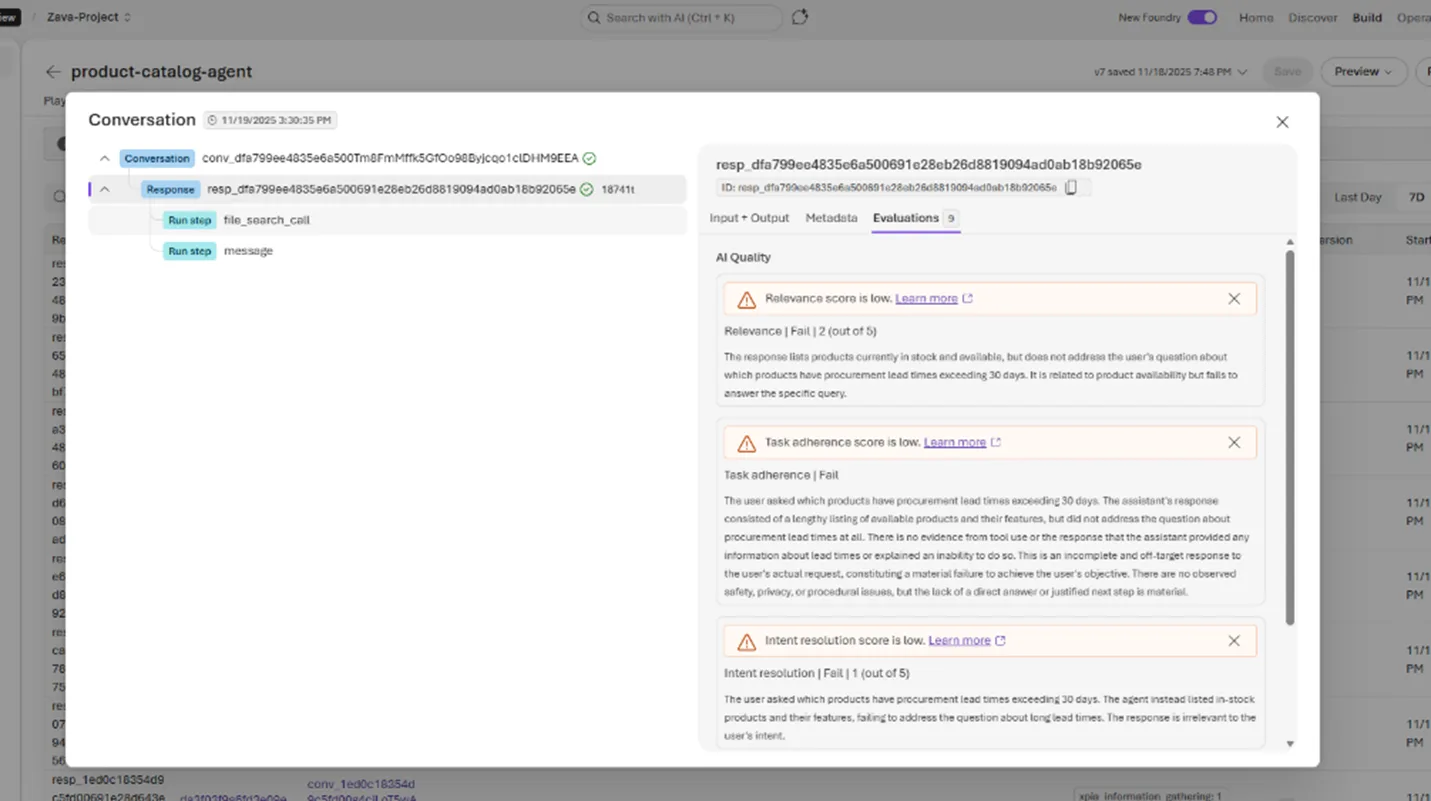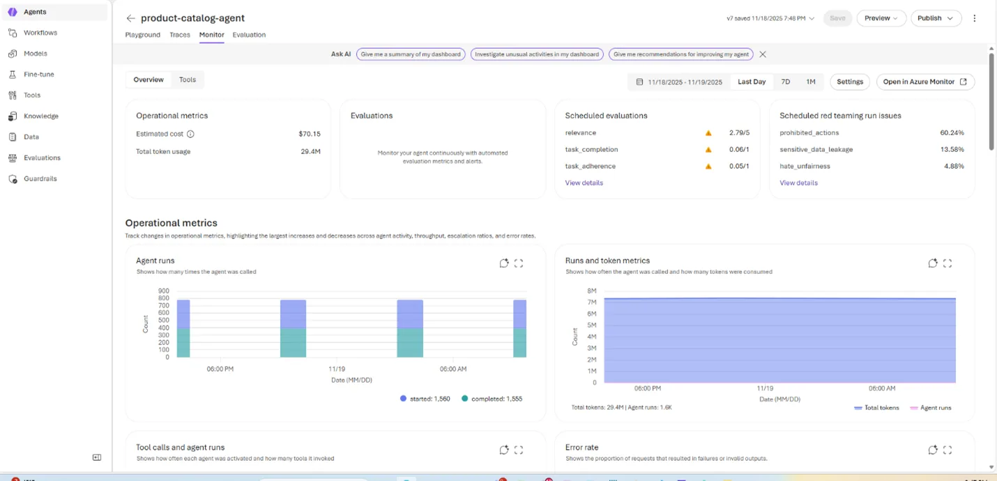 While the first release focuses on observability for individual Microsoft Foundry agents running inside a workflow, teams can already evaluate the complete end-to-end experience by inspecting traces and metrics across every node in the flow.