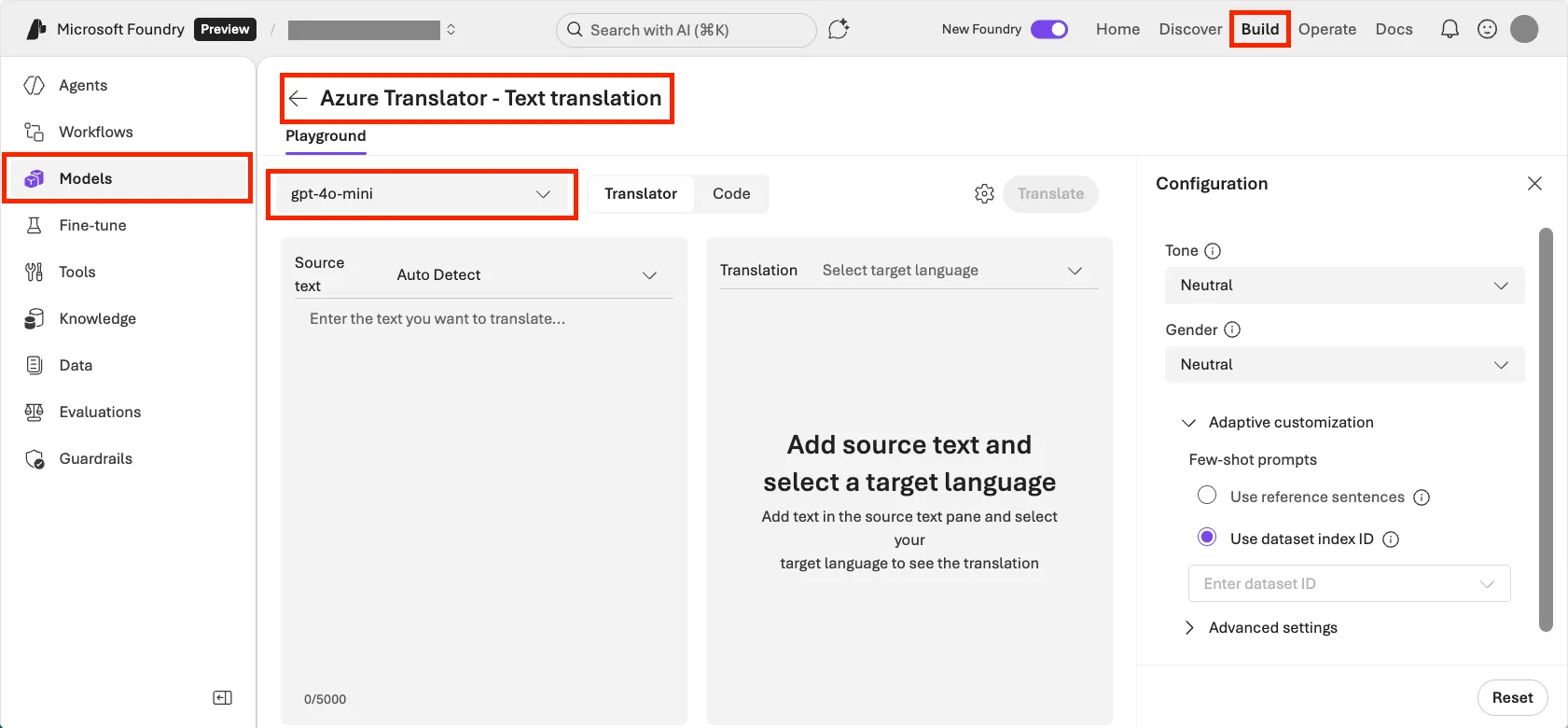 - Select Models > Select AI Services > Select Azure Translation – Text translation