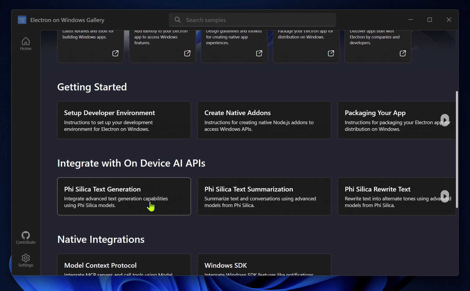 Electron on Windows Gallery includes AI samples for text generation, image captioning, text recognition, and more. These samples showcase local, on-device capabilities such as language understanding with Phi Silica and the Windows AI APIs. These interactive samples are designed to be a reference for how to add Windows AI capabilities into Electron apps.