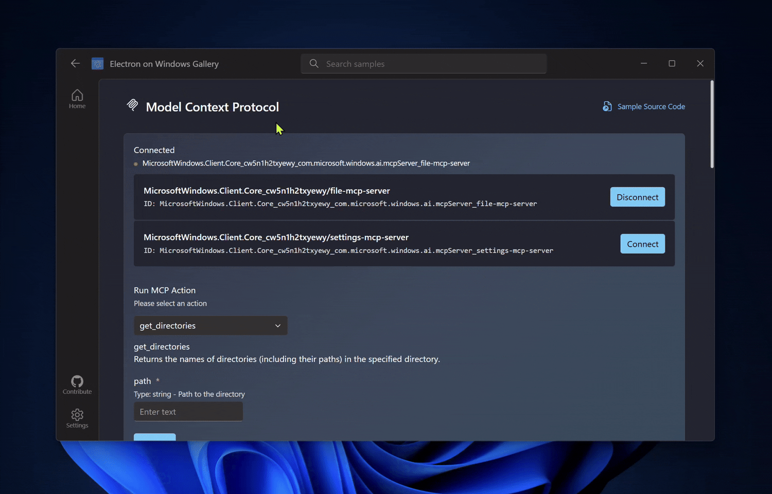 The gallery also includes an MCP (Model Context Protocol) sample. In this sample, Electron on Windows Gallery acts as an MCP host. It enumerates the MCP servers available on your machine, then lets you connect and run actions exposed by the selected server. This sample is a great starting point for developers who want to integrate MCP servers into an Electron experience on Windows.