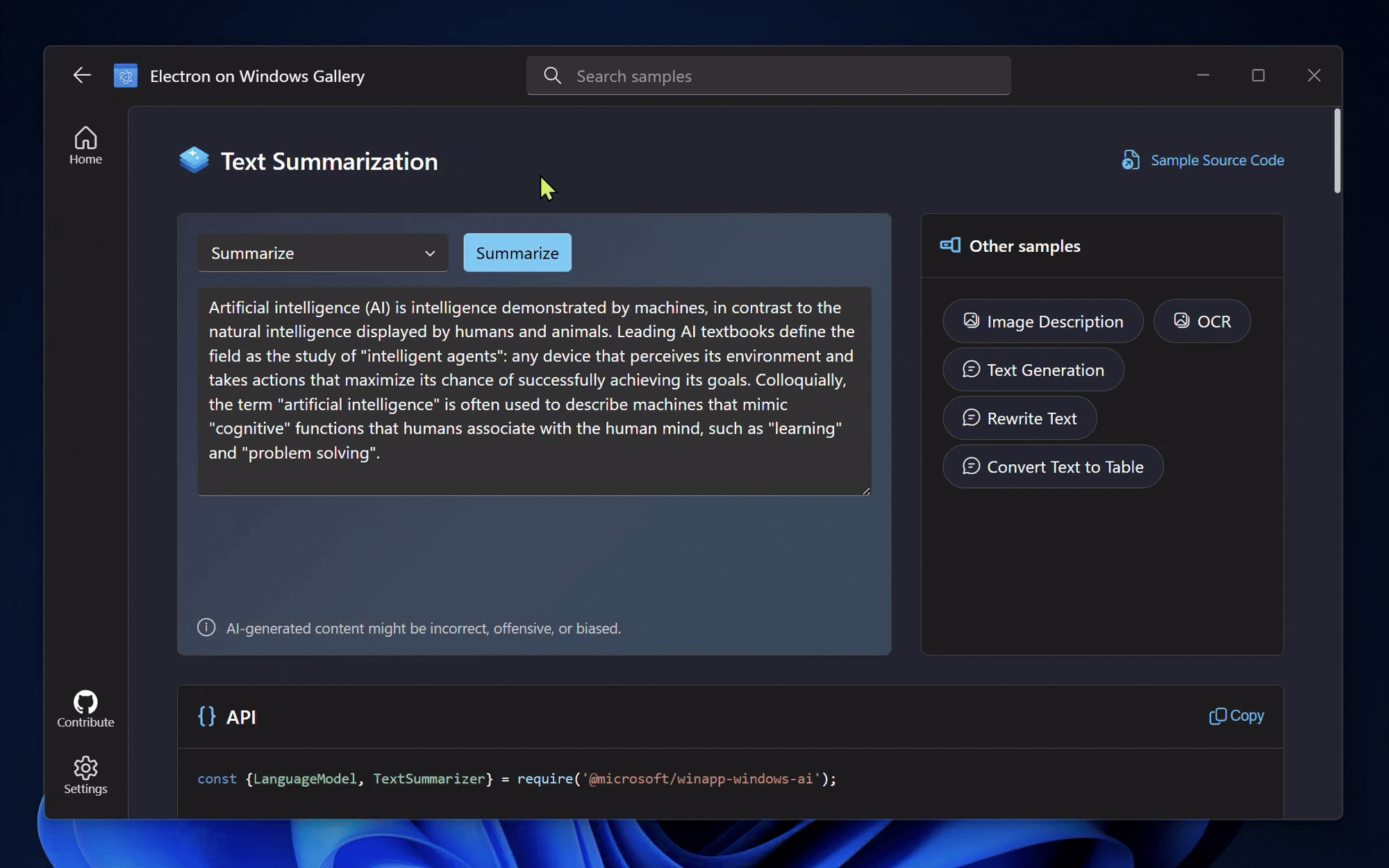 All generative AI experiences in Electron on Windows Gallery are powered by @microsoft/windows-ai-electron, a Node.js addon for Electron that lets apps call Windows AI APIs directly from JavaScript. With just a few lines of JavaScript, it lets you add on-device: