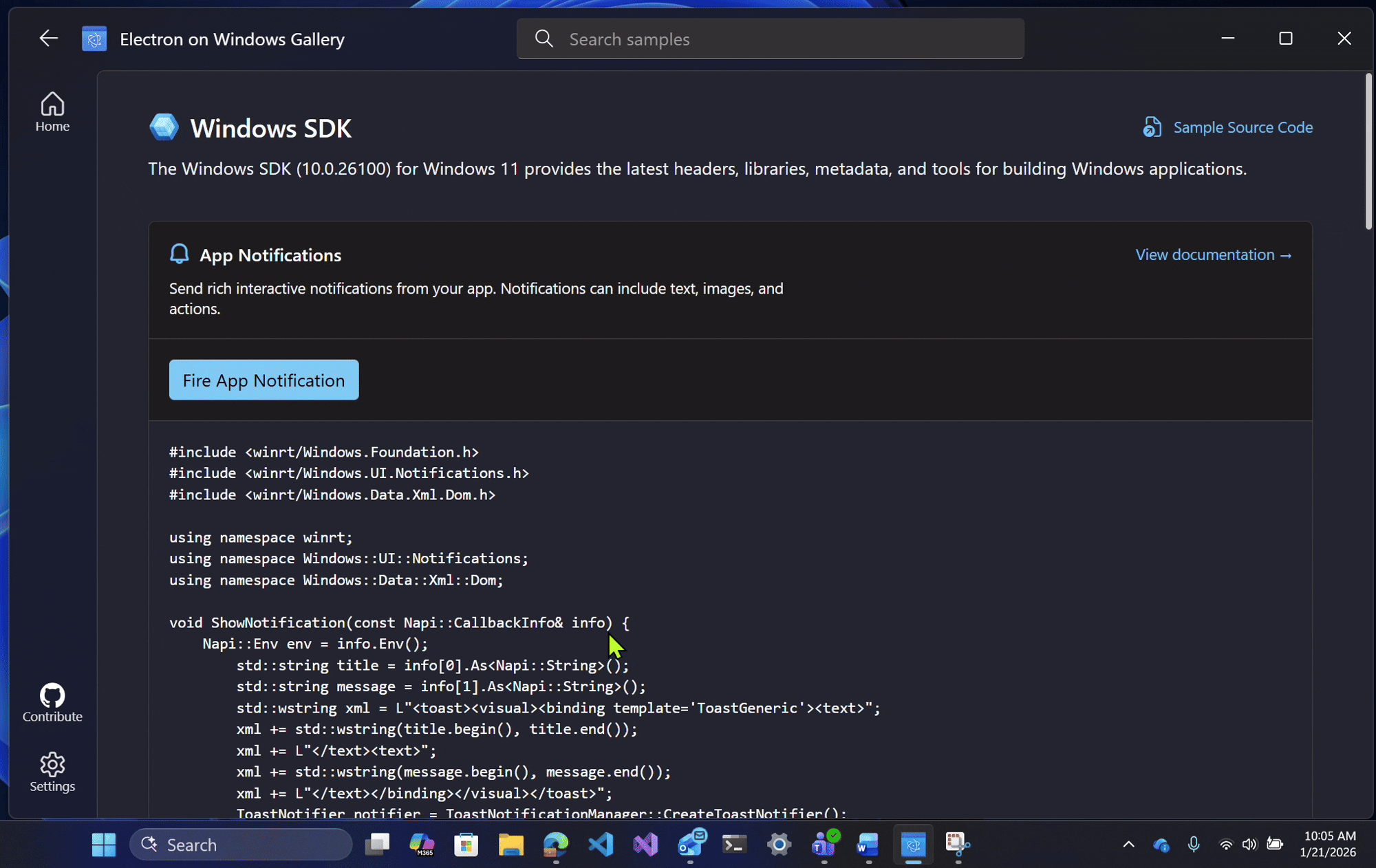 For the implementation details on the Windows SDK sample, see the Electron on Windows Gallery: Windows SDK Sample.