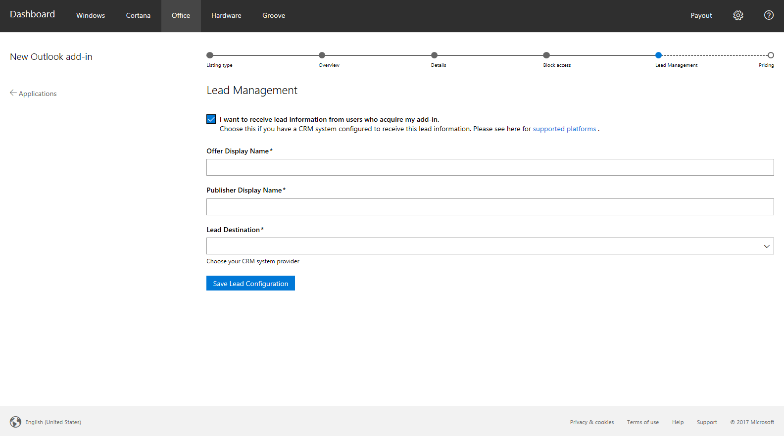 Go to the ISV Seller Dashboard today to setup your CRM information to enable lead sharing. Once logged into the dashboard, select the app or add-in you would like leads for, click ‘Edit Lead Configuration’ and submit your CRM information to let AppSource help you drive business growth!