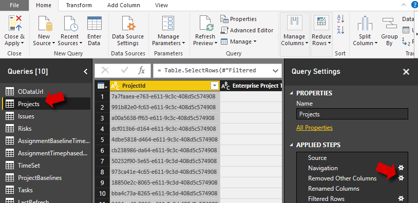 - Choose ‘Edit Queries’ on the ribbon and select on the ‘Projects’ table at the left.