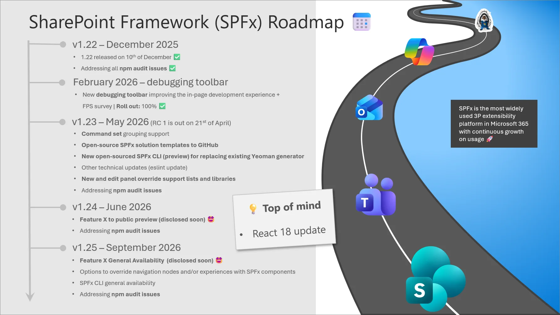 - React 18 support for SPFx solutions – In previous communications, our estimate was that this is coming in June 2026. There’s work being actively done on updating the out-of-the-box web parts to the React 18 level. We can only enable it for custom web parts until that work is completed. This might happen by June, but we cannot currently confirm the schedule and are waiting for updates internally.