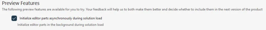 To validate your extension can adapt to this change, enable the Preview Feature flag “Initialize editor parts asynchronously during solution load”.