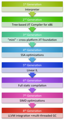 Since then, both the language and the execution environment have continued to evolve and improve. C# went from being a slightly better Java to be light-years ahead. From embracing dynamic programming, bring asynchronicity into the language, introduce iterators, functional programming constructs, embrace parallelism and got a great implementation of generics. Many of the these features came from the research done by Don Syme and his F# team that have kept a steady flow of new ideas getting injected into the language. Furthermore, Mono as a virtual machine has matured substantially in the last 10 years and is now considered to be on its 8th generation.