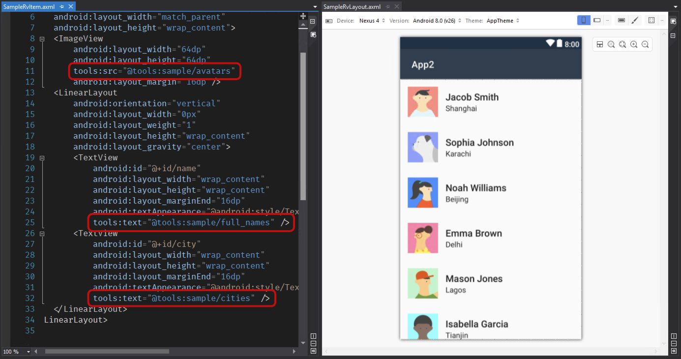 You can now inject sample placeholder data or images into your views so that you can preview how the layout would behave. The following sample data sources are available: